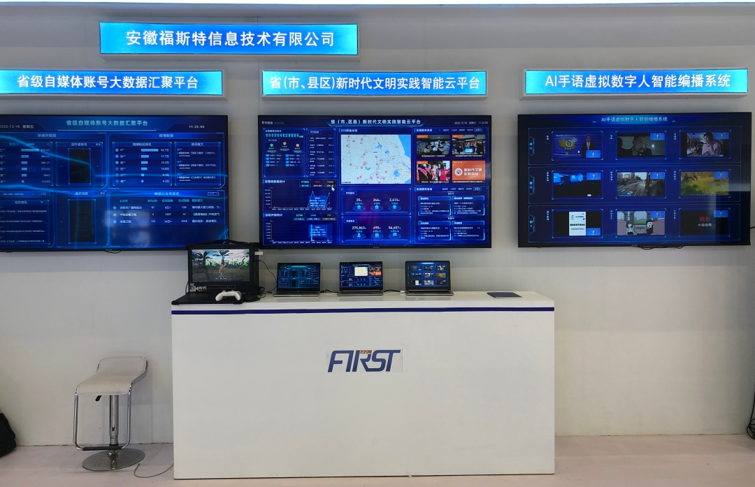安徽福斯特信息技術(shù)有限公司此次應(yīng)邀參展,以廣電媒體發(fā)展為亮點(diǎn),集中展示大數(shù)據(jù)、人工智能,呈現(xiàn)了AI-VLOG視頻智能合成系統(tǒng)+AI手語虛擬數(shù)字人智能編播系統(tǒng)+省級自媒體賬號大數(shù)據(jù)匯聚平臺+省(市、縣區(qū))新時代文明實(shí)踐智能云平臺技術(shù)。